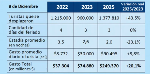 El movimiento por el feriado del 8 de diciembre mostró un repunte en cantidad de turistas y un gasto total cercano a los $250 mil millones.