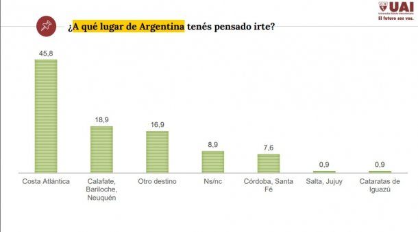 Los destinos elegidos son: la Costa Atlántica (45,8%) y el sur (18,9%) como principales destinos. De los que se van al exterior, prefieren a Estados Unidos (30,3%), Brasil (19,5%), Uruguay (17,3%), Europa (16,3%) y centro América (16,3%), el resto aún no se decidió.