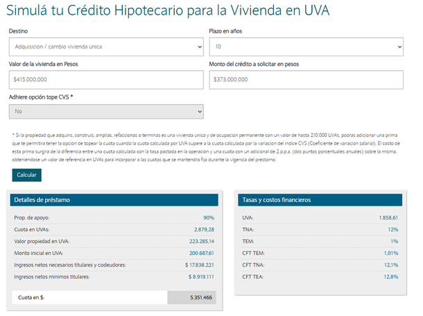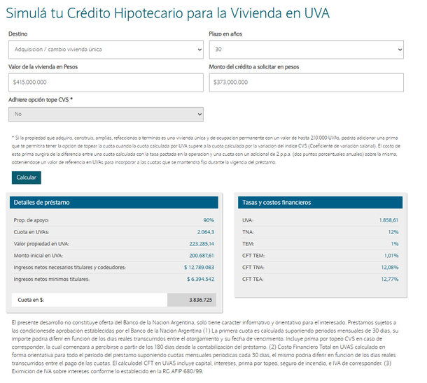 De acuerdo a las opciones que brinda el simulador oficial de Créditos Hipotecarios en UVA para la adquisición de vivienda, solicitar un préstamo de $373.000.000 requiere demostrar niveles de ingresos sumamente elevados. En la simulación (para una propiedad valuada en $415.000.000) se contemplan una Tasa Nominal Anual (TNA) del 12% y un valor UVA de 1.858,61.