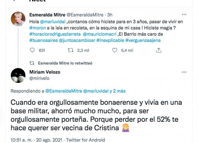 "Hola María Eugenia Vidal, contanos cómo hiciste para en 3 años pasar de vivir en Morón a la isla en Recoleta, en la esquina de mi casa! Hiciste magia ? #horaciorodriguezlarreta mauriciomacri. El Barrio más caro de Buenos Aires @juntoscambioar #inexplicable #verguenzaajena", escribió en Twitter Esmeralda Mitre.