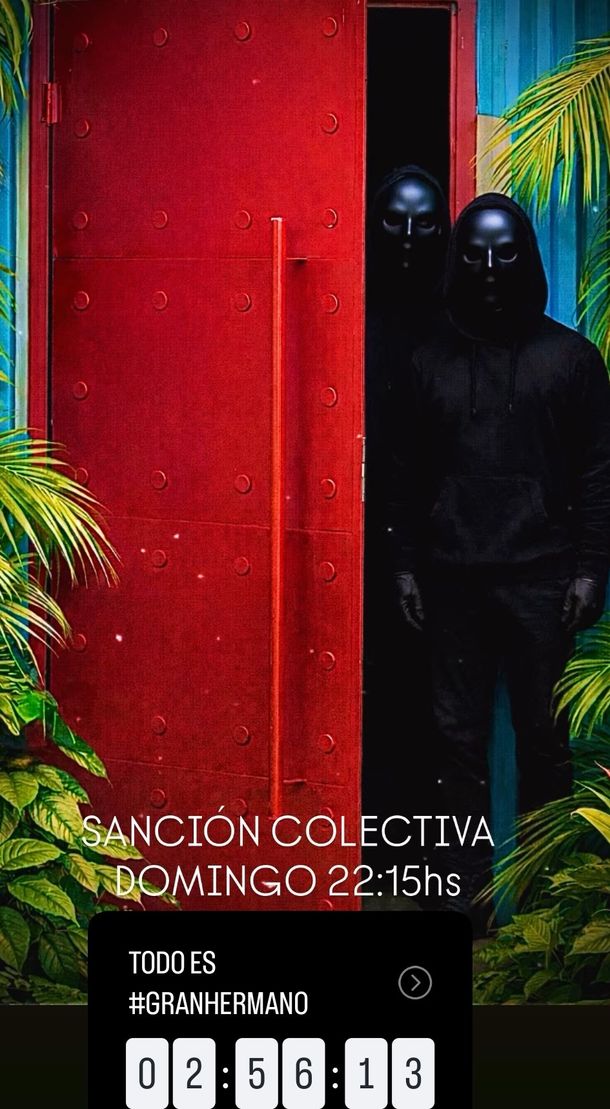 El encargado de adelantar lo que se viene fue Santiago del Moro, quien utilizó sus redes sociales para generar expectativa. “Sanción colectiva. Domingo 22.15 horas”, escribió en sus historias de Instagram, junto a una imagen del jardín de la casa en la que se veían dos figuras con máscaras. Además, sumó una cuenta regresiva, aumentando el misterio y la tensión en torno a la decisión que tomará la producción.