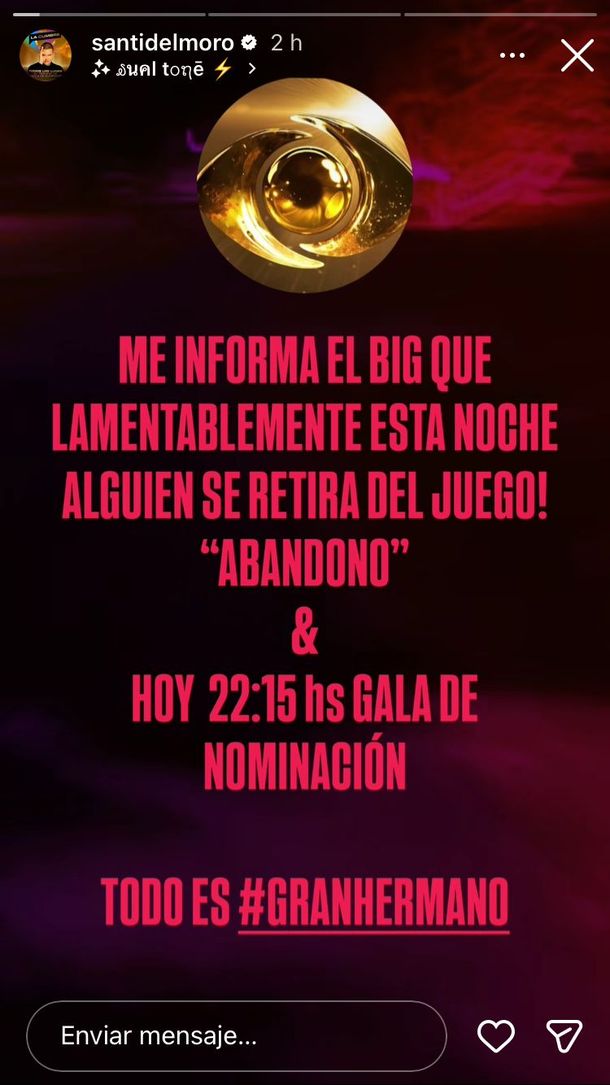 "Me informa el big que lamentablemente esta noche alguien se retira del juego", escribió a través de sus historias de Instagram, sumado a que habrá gala de nominación y se armará una nueva placa para que la gente pueda votar y decidir quién abandona la casa.