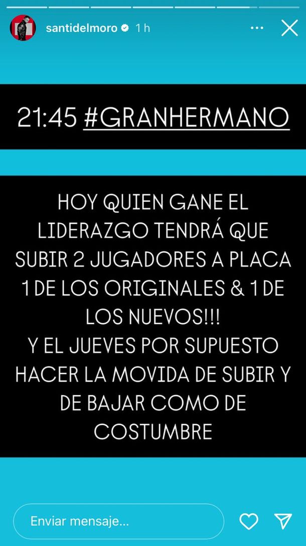 En este sentido, Santiago del Moro hizo un importante adelanto en sus redes sociales: "Hoy quien gane el liderazgo tendrá que subir 2 jugadores a placa: uno de los originales y uno de los nuevos. Y el jueves, por supuesto, hacer la movida de subir y bajar como de costumbre", escribió el conductor en su cuenta de Instagram.