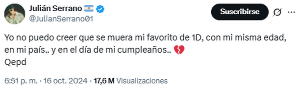 "Yo no puedo creer que se muera mi favorito de 1D, con mi misma edad, en mi país... y en el día de mi cumpleaños. QEPD", escribió Serrano en aquel entonces, acompañando el llamativo mensaje con un emoji de corazón roto.