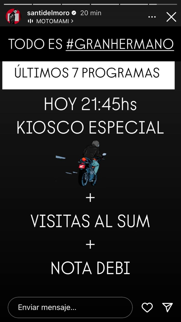 De esta manera, Santiago del Moro reveló qué sucederá hoy en una semana que será por demás vertiginosa: habrá un kiosco especial con el ingreso de "alguien" en moto, visitas al SUM y todo el análisis de la estadía de Devi en la casa.