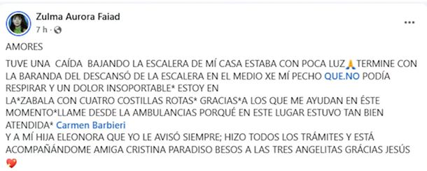 “Tuve una caída bajando la escalera de mi casa, estaba con poca luz. Terminé con la baranda del descanso de la escalera en el medio de mi pecho, que no podía respirar y un dolor insoportable”, relató en su publicación. Allí mismo confirmó que tiene cuatro costillas fracturadas y que permanece bajo observación médica.