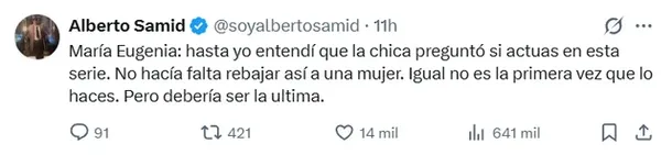 “María Eugenia: hasta yo entendí que la chica preguntó si actuás en esta serie", escribió el empresario. "No hacía falta rebajar así a una mujer. Igual no es la primera vez que lo hacés. Pero debería ser la última”, agregó.