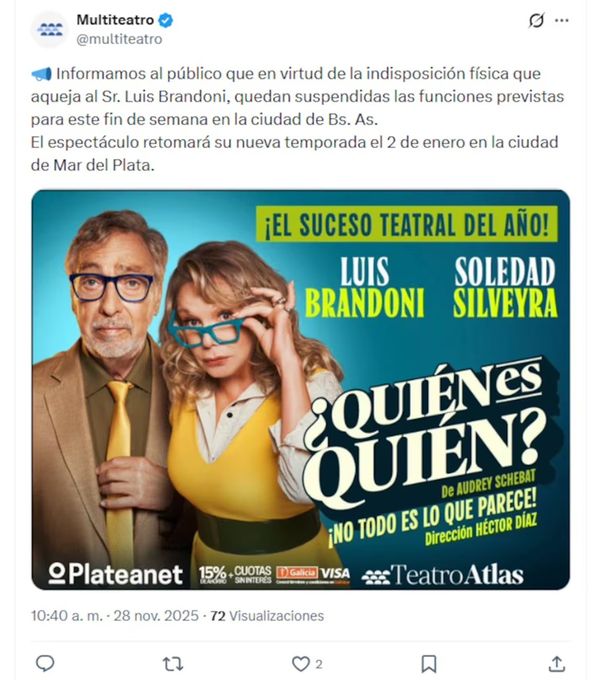 “Informamos al público que en virtud de la indisposición física que aqueja al Sr. Luis Brandoni, quedan suspendidas las funciones previstas para este fin de semana en la ciudad de Buenos Aires”, anunció Rottemberg desde la cuenta de Multiteatro en la red social X.