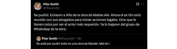 La noticia se conoció a través de las redes sociales, cuando la periodista Pilar Smith reveló el conflicto en su cuenta de X. “Se pudrió. Echaron a Alfa de la obra de Matías Alé. Ahora el ex GH está reunido con sus abogados para iniciar acciones legales”, escribió, y agregó que Santiago sostiene que la decisión estaría relacionada con supuestos celos dentro del elenco. Según esa versión, incluso habría sido eliminado del grupo de WhatsApp de la obra.