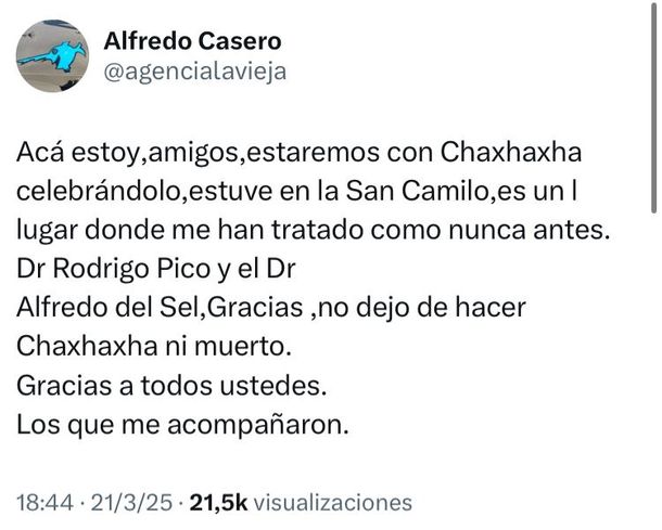 “Acá estoy, amigos. Estaremos con Chachacha celebrándolo. Estuve en la San Camilo. Es un lugar donde me ha tratado como nunca antes”, escribió en redes sociales, pasadas las 15, mientras agradecía a varias personas que lo apoyaron durante su internación.