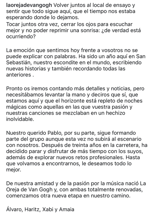 La noticia fue confirmada por la propia banda a través de un comunicado cargado de emoción y nostalgia, en el que recordaron sus inicios en San Sebastián y agradecieron el apoyo incondicional de sus seguidores. “Nos estamos mirando los unos a los otros y, sin decir nada, pensamos todos: está ocurriendo”, escribió el grupo en su cuenta oficial.