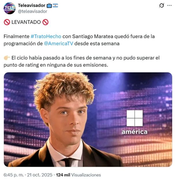 “Finalmente #TratoHecho con Santiago Maratea quedó fuera de la programación de @AmericaTV desde esta semana. El ciclo había pasado a los fines de semana y no pudo superar el punto de rating en ninguna de sus emisiones”, señalaron.