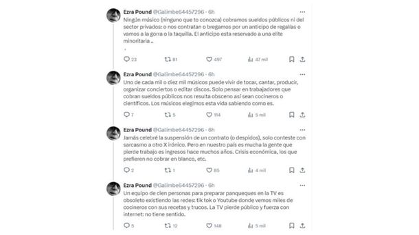 "Ningún músico (ninguno que yo conozca) cobramos sueldos públicos ni del sector privado: o nos contratan o bregamos por un anticipo de regalías o vamos a la gorra o la taquilla. El anticipo está reservado a una elite minoritaria", expresó. Y siguió: "Uno de cada mil o diez mil músicos puede vivir de tocar, cantar, producir, organizar conciertos o editar discos. Solo pensar en trabajadores que cobran sueldos públicos nos resulta obsceno, así sean cocineros o científicos. Los músicos elegimos esta vida sabiendo como es".