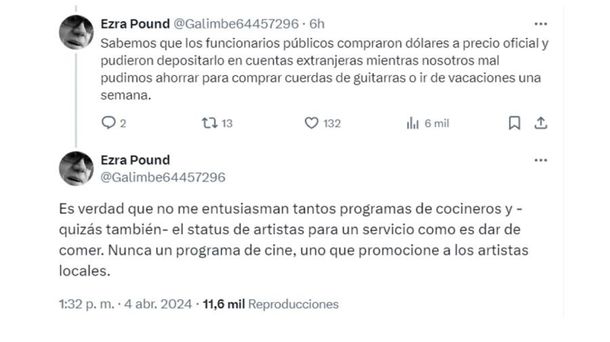A través de la red social X, el usuario @LicMacoco escribió: "Primer Jueves Santo sin Cocineros Argentinos". A lo que el cantante mediante su cuenta "anónima", @Galimbe64457296, escribió: "Muy buena noticia".