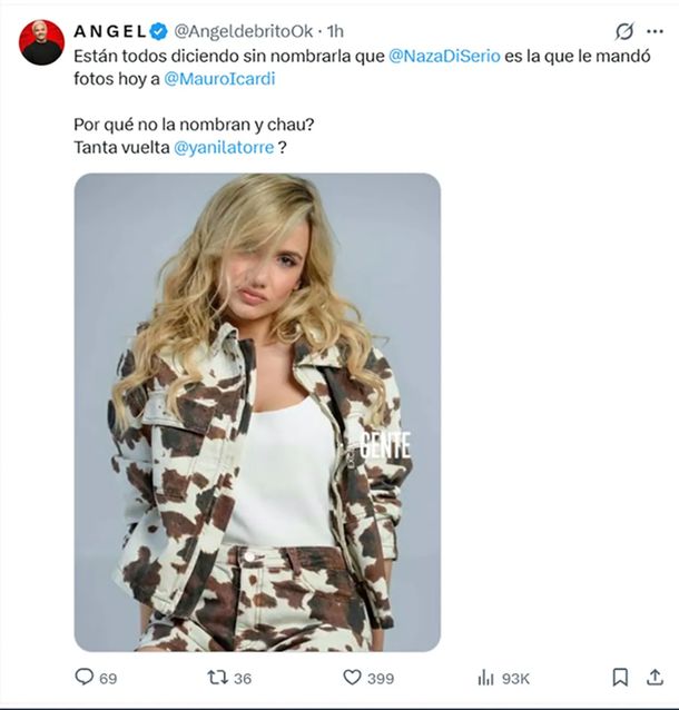 Cuando el tema parecía diluirse entre rumores, Ángel de Brito intervino desde sus redes y publicó: “Están todos diciendo sin nombrarla que Naza Di Serio es la que le mandó fotos hoy a Mauro Icardi”. Por su parte, Naza Di Serio rompió el silencio reaccionó casi de inmediato en su cuenta de X (ex Twitter): “Mirá que soy medio gila, pero meterme ahí justo sería demasiado. Yo no soy”.