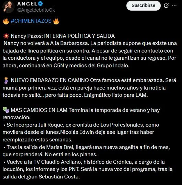 Con el fin del verano cada vez más cerca, las programaciones de cada canal comienzan a rearmarse y, sin lugar a dudas, el programa insignia de las noches de América TV se prepara para una reestructuración significativa en su equipo. Ángel de Brito, fiel a su estilo dinámico y directo, utilizó sus plataformas digitales para anunciar las piezas que se mueven dentro de LAM, introduciendo nuevos rostros y voces que prometen refrescar la pantalla durante este 2026.