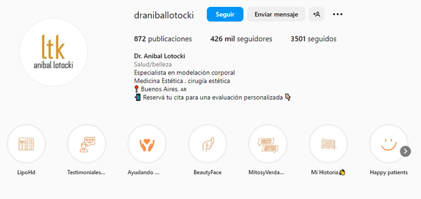 - La verificada @drlotockianibal, en la que se presenta como un perfil de "Belleza y salud", y que tiene como slogan "De tu inversión hacemos tu mejor versión";