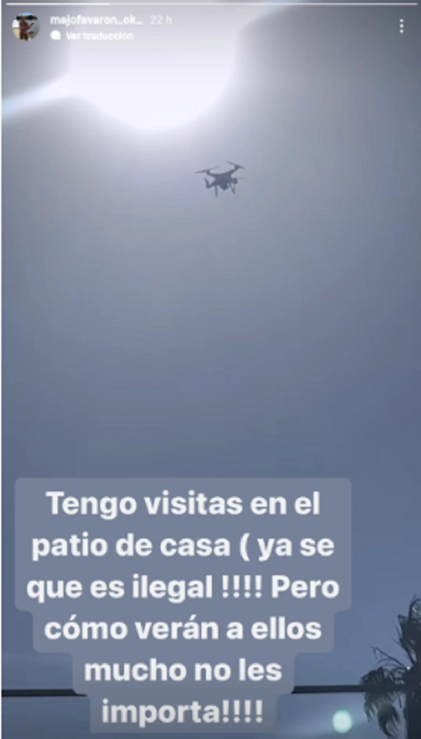 “Tengo visitas en el patio de casa. Ya sé que es ilegal, pero a ellos mucho no les importa”, escribió en las historias de su cuenta de Instagram junto a una foto donde se puede ver un drone merodeando por su jardín.