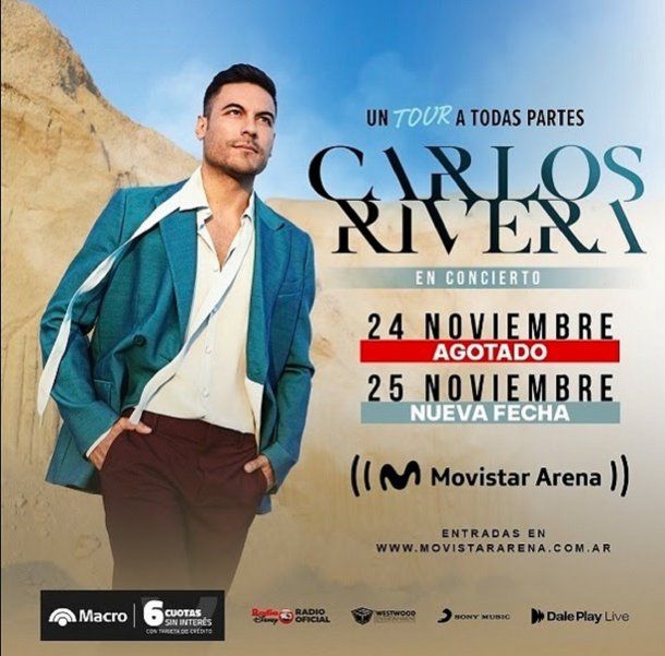 Argentina no es la excepción y el cariño del público se hizo sentir inmediatamente. Así los tickets para el próximo 24 de noviembre en Buenos Aires ya se agotaron y a pedido de sus fans Carlos Rivera anuncia una segunda fecha en el Movistar Arena para el 25 de noviembre. Las entradas con todos los medios de pago ya están a la venta en www.movistararena.com.ar en 6 cuotas sin interes con tarjetas Macro.