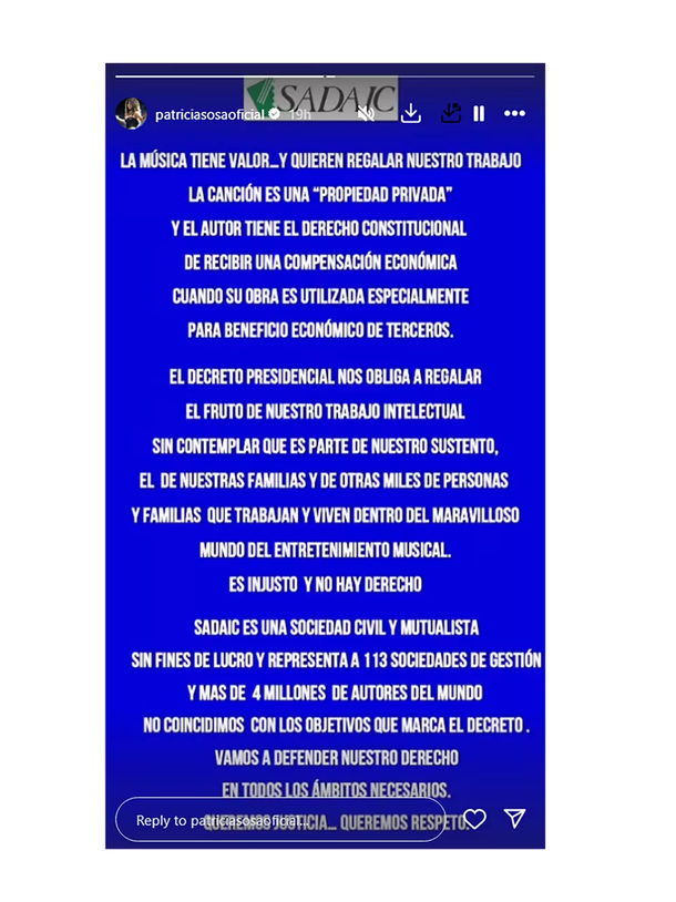 "El decreto presidencial nos obliga a regalar el fruto de nuestro trabajo intelectual sin contemplar que es parte de nuestro sustento, el de nuestras familias y de otras miles de personas y familias que trabajan y viven dentro del maravilloso mundo del entretenimiento musical. Es injusto y no hay derecho", sentenció.