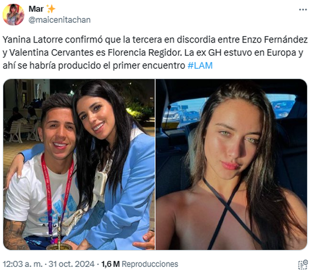 En medio de esta separación, Yanina Latorre aseguró que Flor Regidor es la tercera en discordia entre la pareja mencionada. En torno a ello, sostuvo que la ex Gran Hermano estuvo en Europa, donde vio a escondidas al mediocampista.