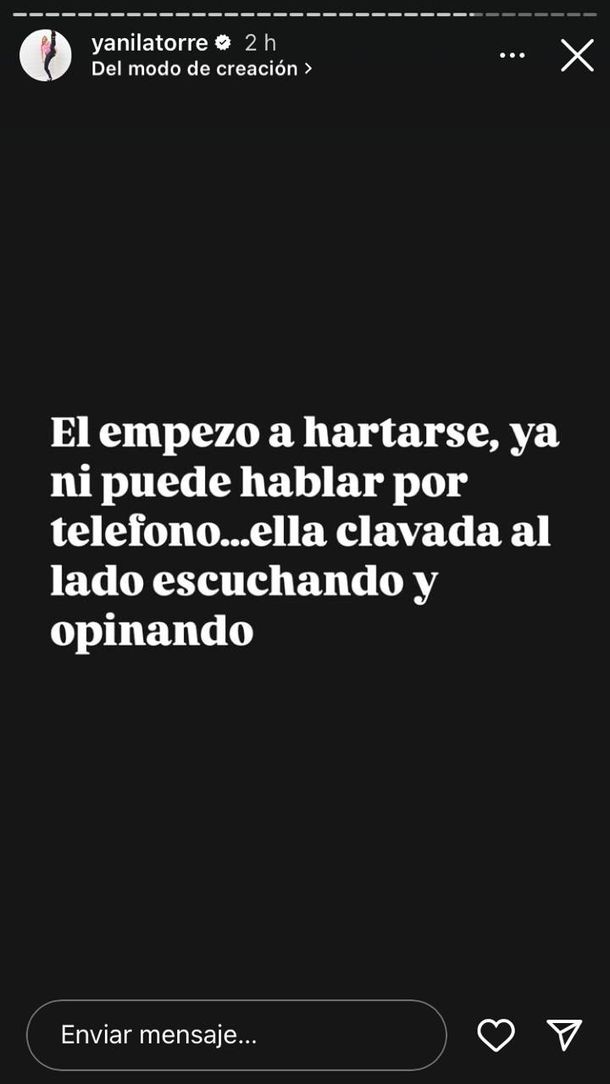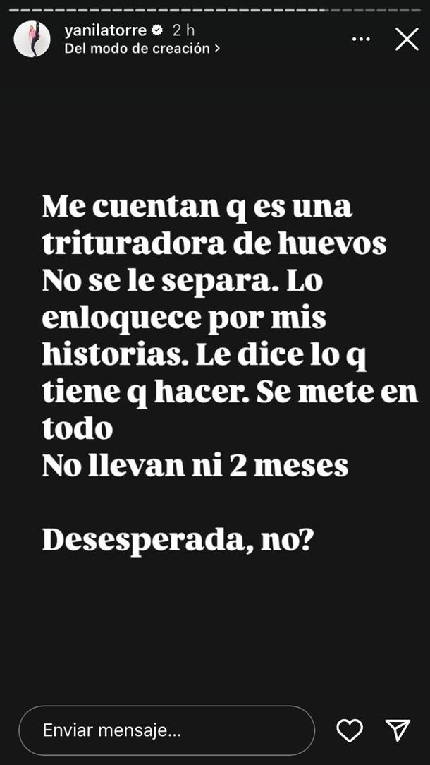 Seguidamente, Latorre agregó: "Me cuentan que es una trituradora de huevos. No se le separa. Lo enloquece por mis historias. Le dice lo que tiene que hacer. Se mete en todo. No llevan ni dos meses. Desesperada, ¿no?".