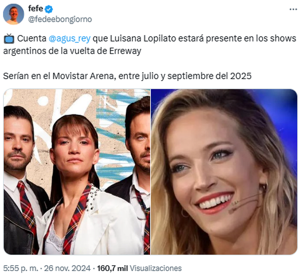 Lo cierto es que esta información habría cambiado en las últimas horas, según lo aportado por el periodista Agustín Rey. "Luisana Lopilato estará presente en los shows argentinos de la vuelta de Erreway", escribió Federico Bongiorno, otro periodista especialista en espectáculos, que levantó la información de su colega en redes sociales.