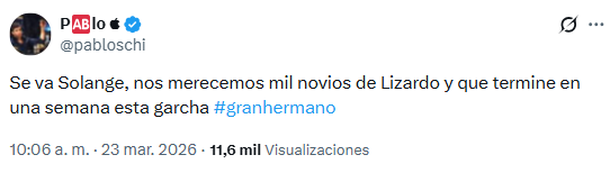 Pabloschi, también conocido como el "gurú de las eliminaciones", manifestó: "Se va Solange, nos merecemos mil novios de Lizardo y que termine en una semana esta garcha #GranHermano", visiblemente indignado porque Sol es una de las participantes que más vida le otorga al juego.