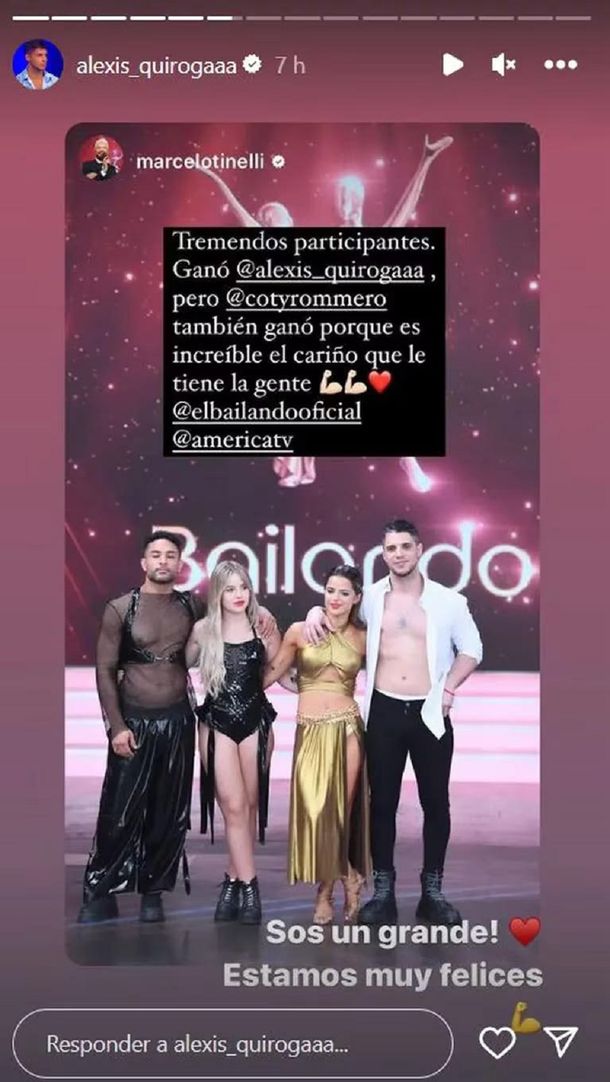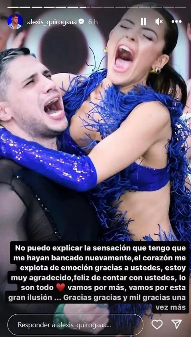 A través de una historia de Instagram, Alexis “Conejo” Quiroga agradeció ser elegido por el público para continuar dentro de los mejores del Bailando 2023. El duelo estaba cargado de emoción y tensión porque el participante se enfrentó con su ex Coti Romero, con quien vivió una historia de amor en Gran Hermano 2022 y, tiempo después, todo terminó.