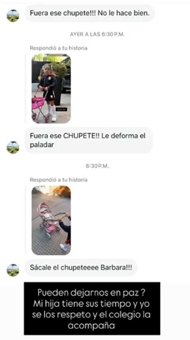 Una seguidora escribió de manera reiterada: “¡Fuera ese chupe! No le hace bien”, “Le deforma el paladar” y “¡Sacale el chupete, Bárbara!”. No fue un comentario aislado. Ese tipo de cuestionamientos se repitió en distintas publicaciones y volvió a instalar un debate que la modelo ya enfrentó en otras oportunidades.