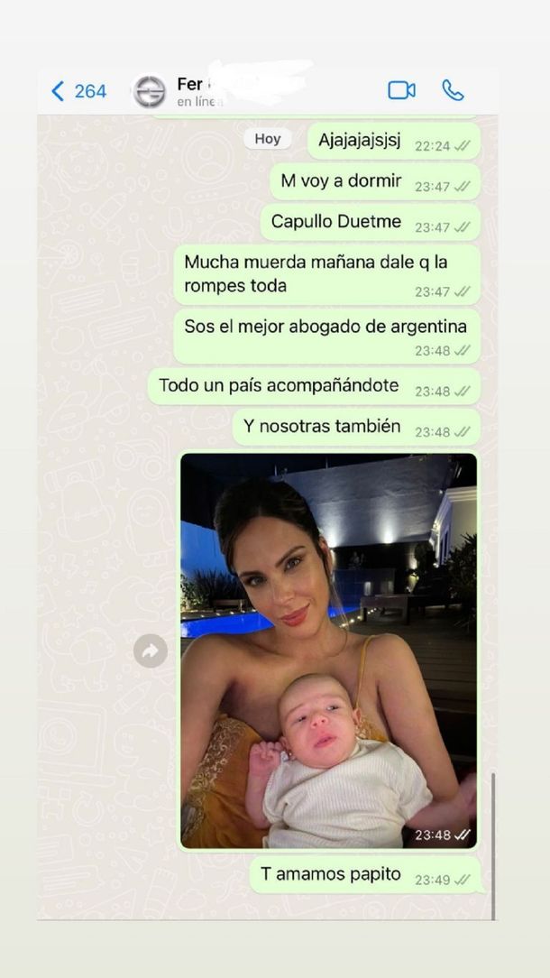 "Mucha mierd@ mañana. Vamos que la rompés toda. Sos el mejor abogado de la Argentina. Todo un país acompañándote y nosotras también", se pude leer en el mensaje que fue acompañado con una foto de ella y la beba.