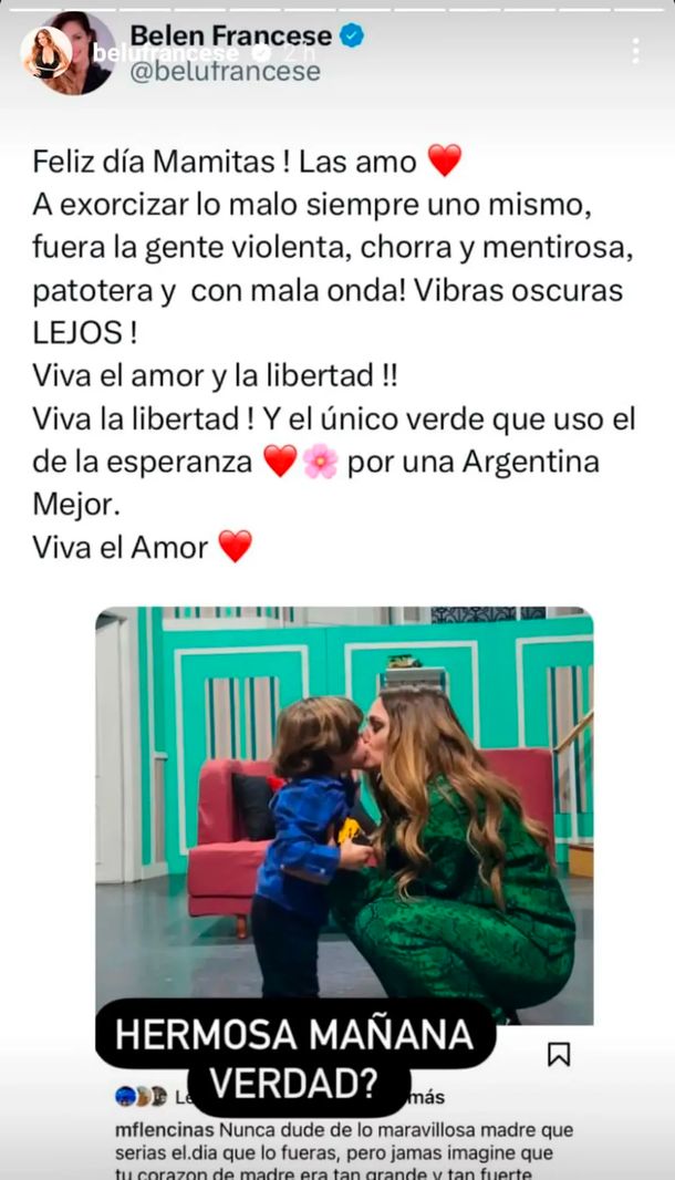 “¡Feliz día, mamitas! Las amo. A exorcizar lo malo siempre uno mismo. ¡Fuera la gente violenta, chorra y mentirosa, patotera y con mala onda!”, comenzó diciendo Belén.