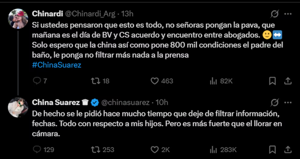 Mientras tanto, la China Suárez mantuvo una postura combativa en redes sociales. En su cuenta de X, publicó una serie de mensajes donde dejó entrever su malestar con el padre de sus hijos y su modo de manejar la exposición pública. “Es más fuerte que él llorar en cámara”, escribió, generando aún más ruido mediático.