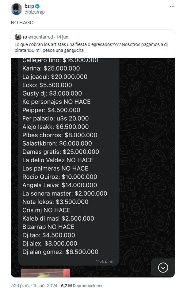 Bizarrap se refirió a la lista viral de precios de artistas para fiestas de egresados