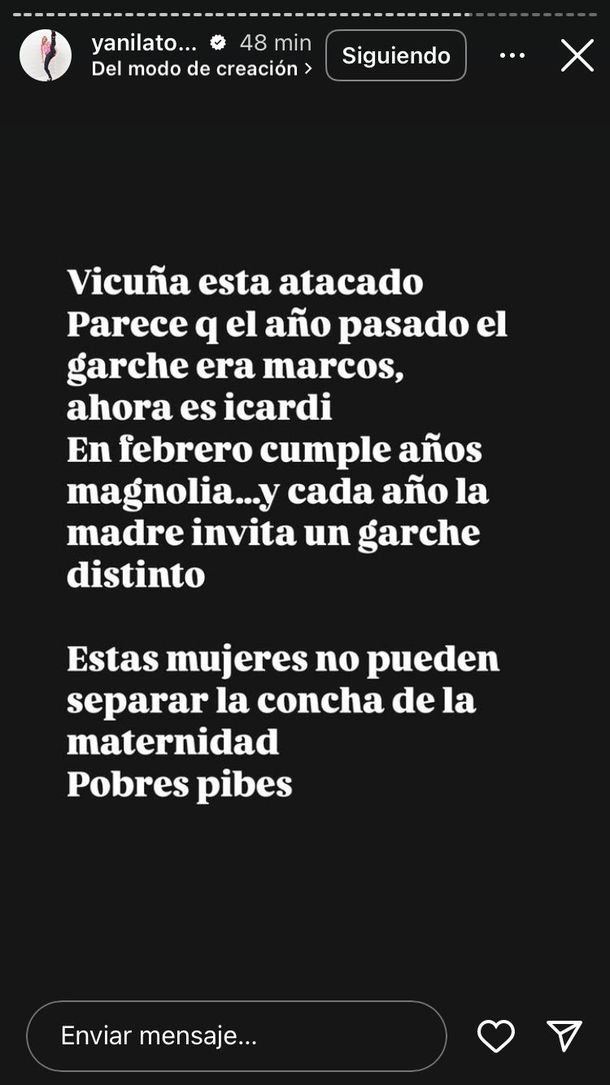 Sin lugar a dudas, el galán chileno tiene un perfil muchísimo más bajo que su expareja y madre de dos de sus hijos: la China Suárez. En medio del escándalo que desató la mamá de Magnolia y Amancio Vicuña, Yanina informó el estado del actor: "Vicuña está atacado. Parece que el año pasado el garche era Marcos (Ginocchio), ahora es Icardi, en febrero cumple años Magnolia... y cada año la madre invita a un garche distinto", contó.