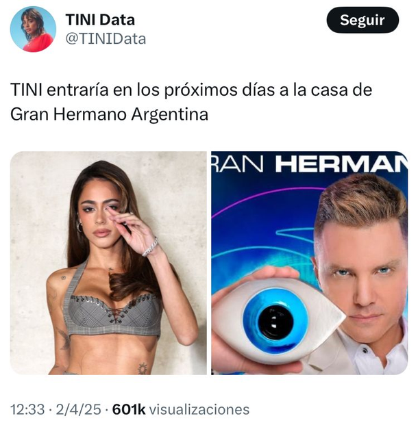Con todas estas novedades, ahora se rumorea lo que podría ser una verdadera bomba: "Tini entraría en los próximos días a la casa de Gran Hermano", escribió una cuenta fan de la artista y hay varios motivos para pensar que no es una posibilidad descabellada.