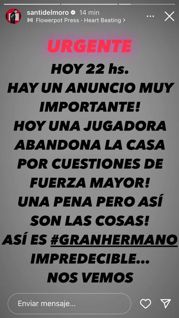 En este sentido, agregó: "¡Hoy una jugadora abandona la casa por cuestiones de fuerza mayor! ¡Una pena, pero así son las cosas!". Y subrayó: "Así es Gran Hermano, impredecible", en lo que significa uno de sus habituales adelantos previos a la gala, ya sea de nominación o de expulsión.