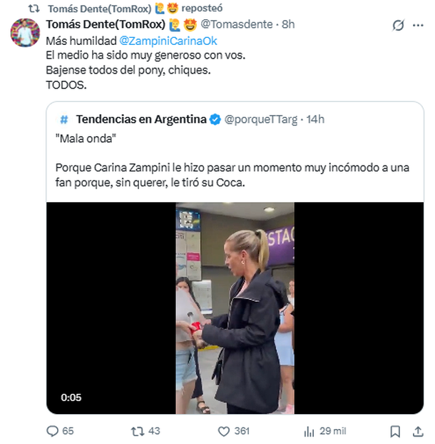 Entre las reacciones más resonantes estuvo la del periodista Fede Flowers, quien manifestó su disgusto al escribir: “Siempre fuiste tan especial, Carina Zampini”. En la misma línea, Tomás Dente también apuntó contra la actriz y lanzó: “Más humildad, Carina Zampini. El medio ha sido muy generoso con vos. Bájense todos del pony, chiques. Todos”.