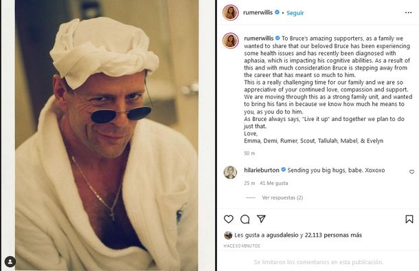 La noticia fue dada a conocer a través de un comunicado conjunto de la familia del actor de 67 años y con cinco décadas de trayectoria en cine y televisión, publicado en la cuenta de Instagram de Rumer Willis, hija del intérprete y de Demi Moore.