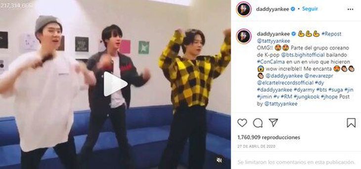 En su cuenta de Instagram se había mostrado como un verdadero fan al comentar: “¡OMG! Parte del grupo coreano de K-pop @bts.bighitofficial bailando #ConCalma en un en vivo que hicieron. Wow, ¡increíble! Me encanta”.