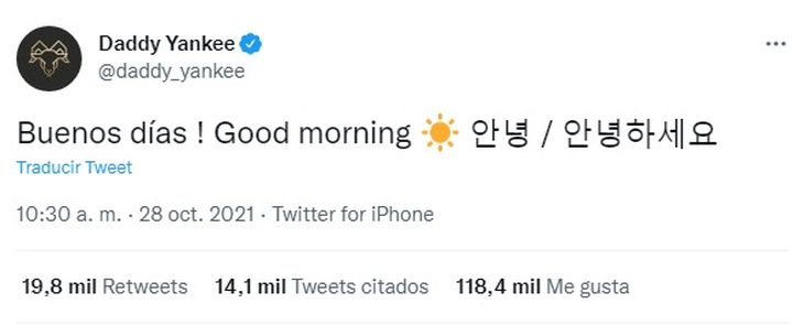 Todo comenzó cuando el propio Daddy Yankee se animó a publicar un tuit escrito en coreano en el que saludaba a sus seguidores de manera informal (se lee annyong) y formal (se lee annyonghaseio).