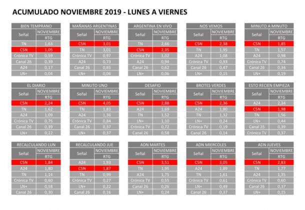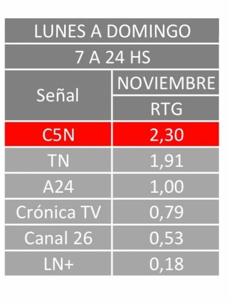 C5N lideró el rating de noviembre entre las señales de noticias de la televisión por cable. El canal alcanzó los 2.30 puntos de promedio de lunes a lunes, según las mediciones de Ibope.