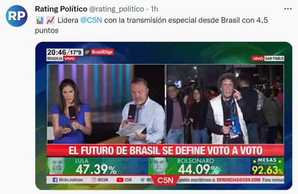 La señal de noticias C5N arrasó en el rating este domingo con la cobertura de las elecciones en Brasil, donde ganó Lula pero habrá segunda vuelta.