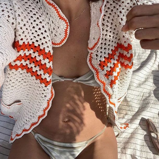 Calu Rivero lució un look muy veraniego. Una microbikini compuesta por la parte superior de un corpiño en forma triangular con tiras y la parte inferior una bombacha colaless con tiras para sujetar por los costados.
