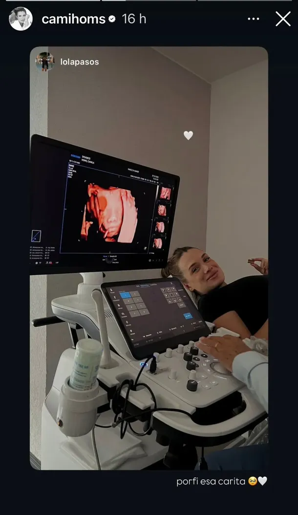 “Porfi, esa carita”, fue el mensaje de Homs en la fotografía que compartió en sus historias. En la imagen, se la puede ver recostada en la camilla, mientras se realiza el estudio. A su vez en la pantalla del ecógrafo se ve la cara de la beba en primer plano, donde se pueden apreciar las facciones.