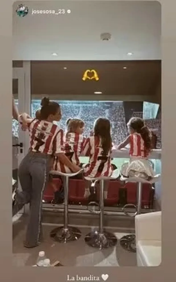 Homs reposteó la foto que subió Sosa con sus hijos y la hija de De Paul con la camiseta de Estudiantes en el palco viendo el partido. “La bandita”, escribió la modelo. Esto no fue tomado de la mejor manera por las redes sociales, quienes la acusaron de “pocos códigos”.