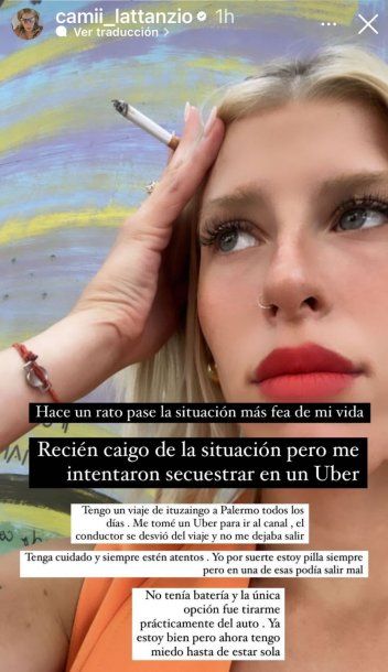“Hace un rato pasé la situación más fea de mi vida”, contó con una historia de Instagram. Entonces, acusó: “Recién caigo de la situación, pero me intentaron secuestrar en un Uber”.