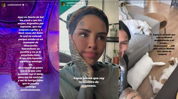 "Ayer en Puerta del Sol me crucé a una señora mayor, argentina por supuesto, que me empezó a gritar y a decir cosas del dólar, lo cual no entendí porque estaba en un momento de disociación fumándome un puchito y no se le escuchaba bien", empezó a comentar Cande Tinelli en su cuenta de Instagram.