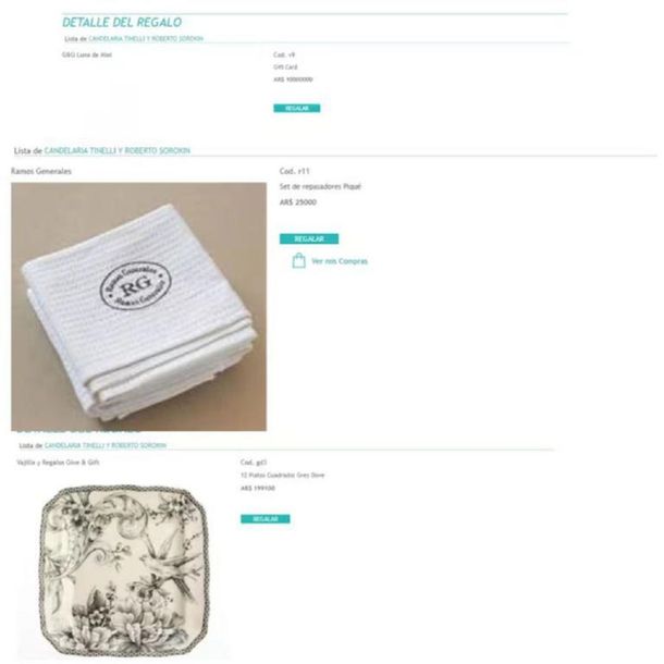 Los tortolitos hicieron una lista diversa que incluye opciones asequibles y lujosas para que los invitados elijan. Entre las opciones más destacadas se encuentran un juego de repasadores, sábanas de hilo belga y una gift card para la luna de miel.