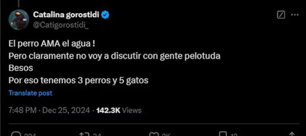 Pero esto no alcanzó, sino que continuaron atacándola, por lo que volvió a hacer un descargo, pero esta vez en la red social "X": “El perro ama el agua, pero claramente no voy a discutir con gente pel... Besos. Por eso tenemos 3 perros y 5 gatos”.